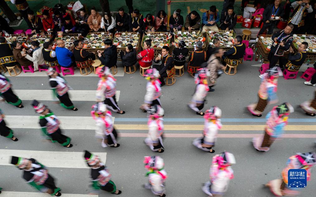 當日,云南省紅河哈尼族彝族自治州綠春縣舉行哈尼族長街宴活動。當地哈尼族群眾身著節日盛裝,載歌載舞,與游客共慶2023云南·綠春哈尼十月年長街古宴文化旅游節。長街古宴是哈尼族“十月年”中的一個習俗,當地群眾通過長街古宴慶祝豐收、祈福納祥。