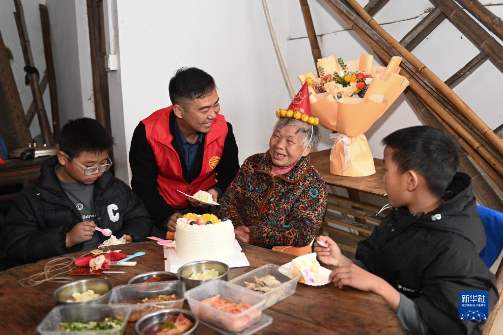 11月19日,在慈溪市白沙路街道隆興村,居家養老服務中心的志愿者為74歲的低保獨居老人盧鳳娣提供送餐服務,并為老人祝賀生日。慈溪市全面實施、推進老年助餐服務“倍增”計劃,目前每日助餐服務7000余人次,覆蓋全市所有村(社區)。