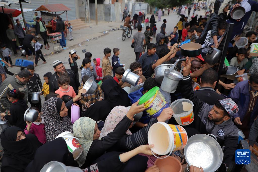 11月19日,在加沙地帶南部城市拉法,人們領取救濟食物。