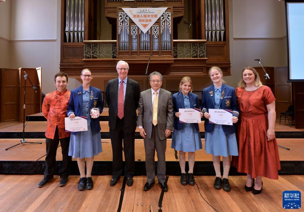11月18日,在澳大利亞阿德萊德,中國駐阿德萊德總領事李東(中),澳中文化交流促進會榮譽會長約翰·塔普林(左三)與“澳洲人唱中文歌”比賽一等獎獲得者沃爾福德圣公會女子學?!疤鹈勖邸苯M合合影。