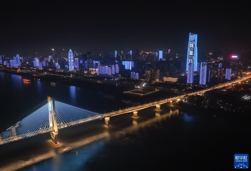 11月20日,武漢長江二橋、長江兩岸建筑為世界兒童日亮燈(無人機照片)。