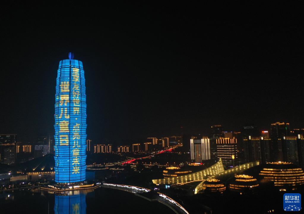 當日是世界兒童日,一些地區的地標建筑點亮象征兒童友好的藍色燈光。