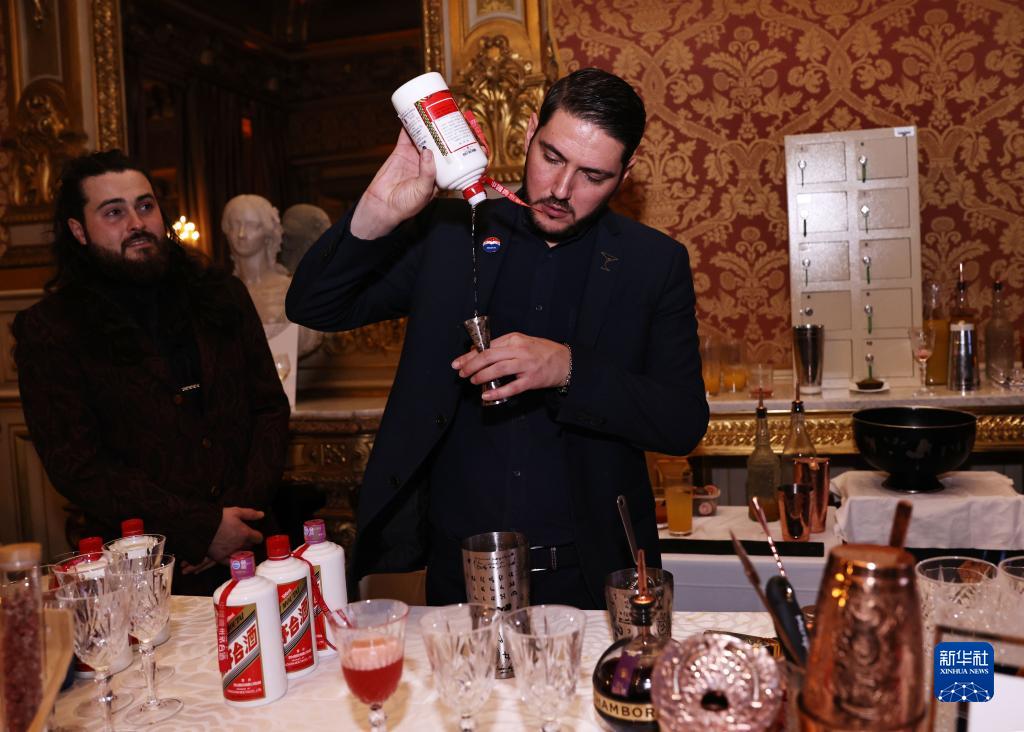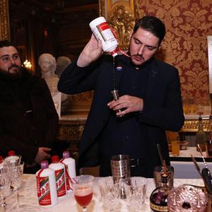 11月20日,在位于巴黎的法國外交部舉行的LA LISTE國際美食榜單揭曉活動現場,調酒師制作茅臺雞尾酒。