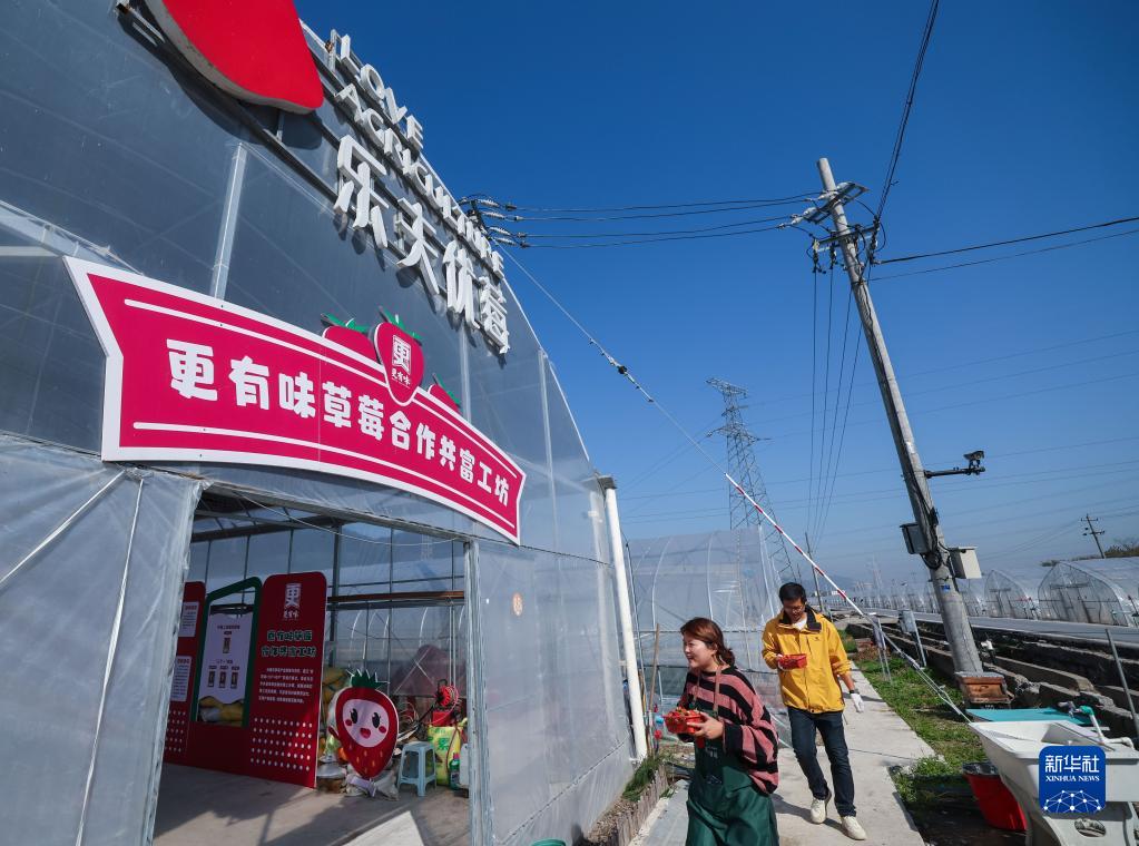 在浙江省建德市更樓街道“更有味”草莓共富合作工坊大棚內,“頭茬”早熟草莓搶鮮上市。莓農們忙著采收新鮮草莓,通過快遞發往杭州、上海等多地市場。