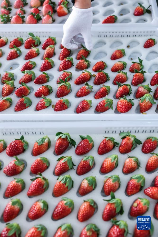在浙江省建德市更樓街道“更有味”草莓共富合作工坊大棚內,“頭茬”早熟草莓搶鮮上市。莓農們忙著采收新鮮草莓,通過快遞發往杭州、上海等多地市場。