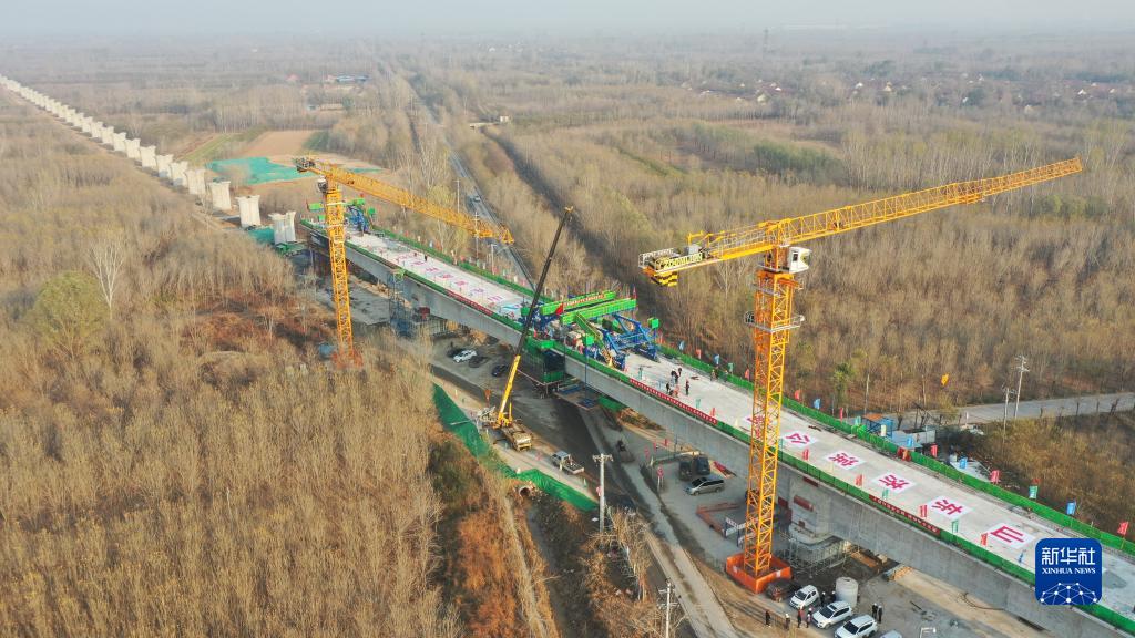 11月20日,在濟濱高鐵商惠濱2號特大橋,山東路橋集團的工作人員在進行橋梁合龍作業(無人機照片)。