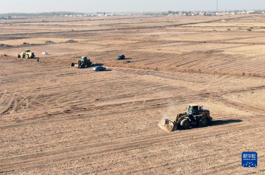 11月15日,內蒙古巴彥淖爾市杭錦后旗蠻會鎮公益渠村進行高標準農田建設(無人機拍攝)。