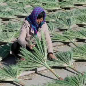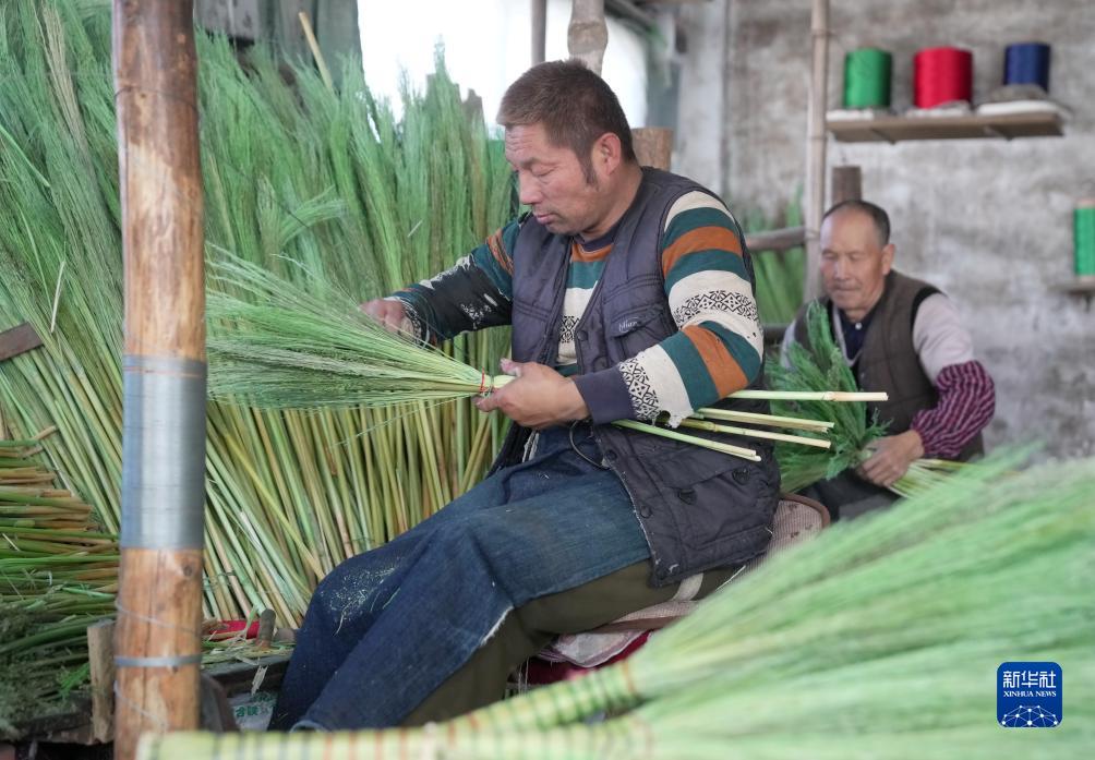 11月21日,河北省樂亭縣毛莊鎮一家笤帚專業合作社的社員在制作笤帚。