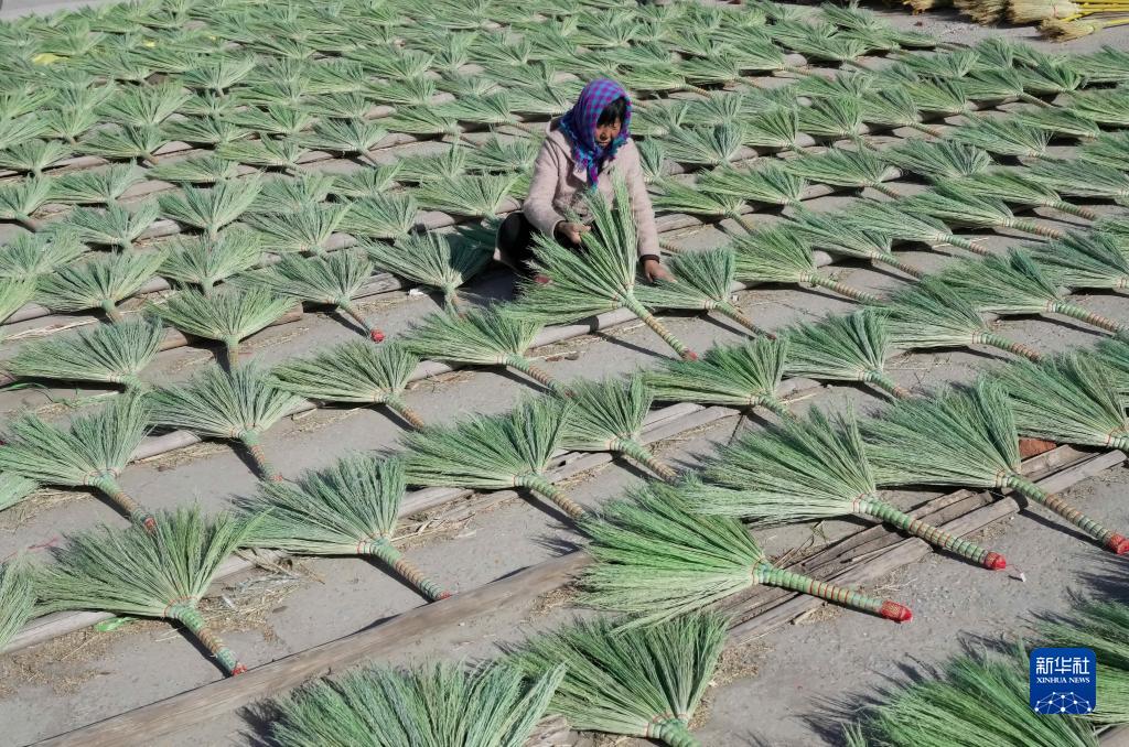 11月21日,河北省樂亭縣毛莊鎮一家笤帚專業合作社的社員在制作笤帚。
