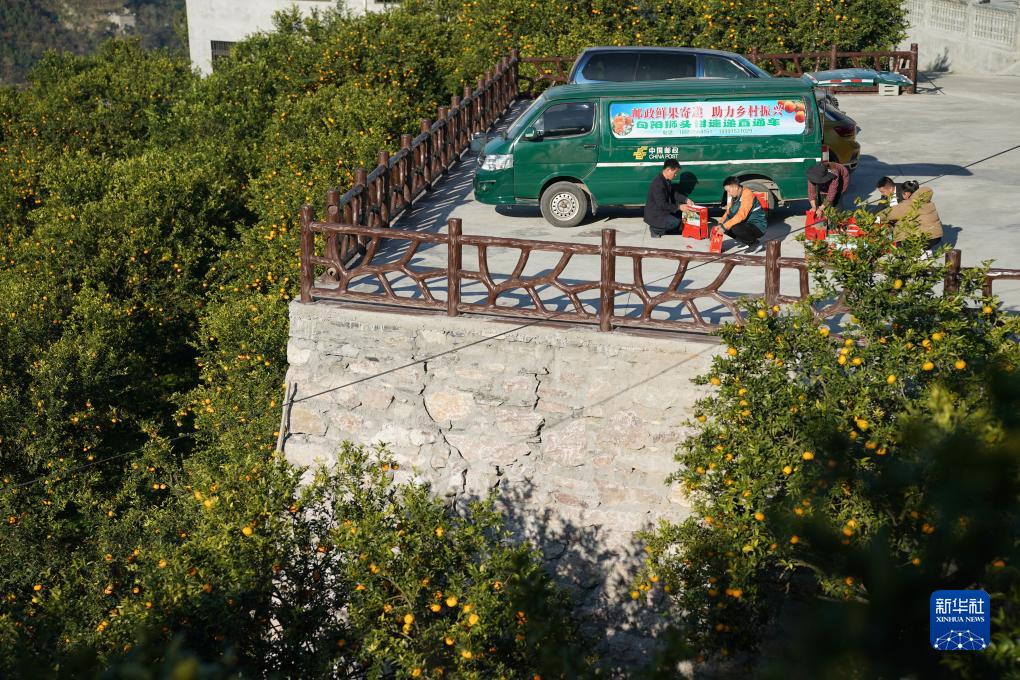 11月20日,在旬陽市呂河鎮冬青樹村,從事郵政鮮果寄遞業務的工作人員與村民一起包裝獅頭柑,裝車外運。