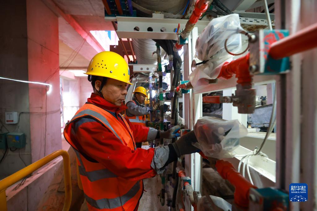 11月21日,來自中建八局的工程施工人員在作業場所對盾構機運行進行維護監測。