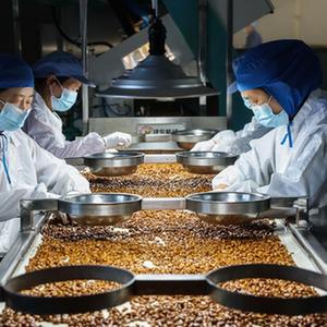 11月21日,在諸暨市店口鎮的一家食品有限公司車間內,工作人員在打包炒貨。