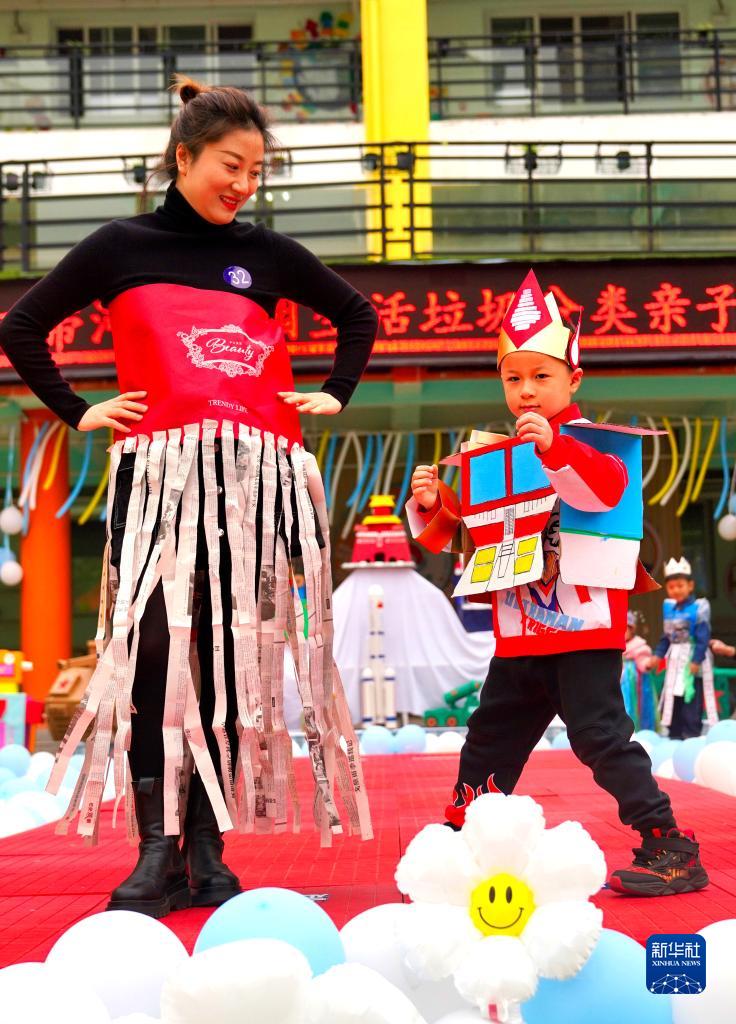 當日,四川省瀘州市龍馬潭區玉帶河幼兒園舉辦了一場垃圾分類親子時裝秀,小朋友和家長身著用廢紙殼、塑料袋、舊報紙等材料制作的各類創意服裝走上舞臺進行展示,讓低碳生活、變廢為寶的理念深入幼兒心靈。