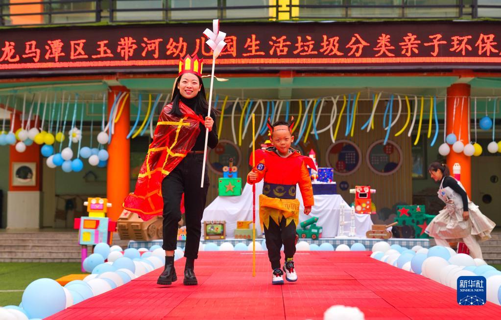 當日,四川省瀘州市龍馬潭區玉帶河幼兒園舉辦了一場垃圾分類親子時裝秀,小朋友和家長身著用廢紙殼、塑料袋、舊報紙等材料制作的各類創意服裝走上舞臺進行展示,讓低碳生活、變廢為寶的理念深入幼兒心靈。