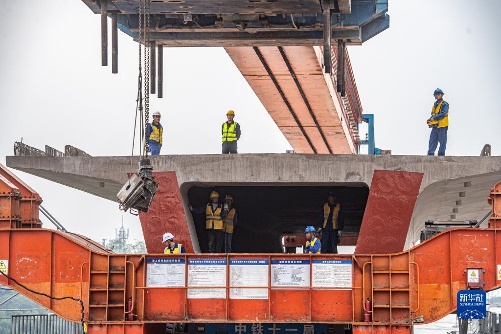 11月21日,在渝昆高鐵川渝段樓灣特大橋建設施工現場,施工人員進行箱梁架設作業。