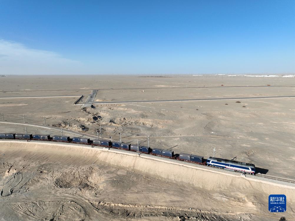 11月21日,首趟“敦煌號”(敦煌-天津港-泰國)鐵海聯運國際貨運班列駛出敦煌鐵路西貨站綜合貨場(無人機照片)。