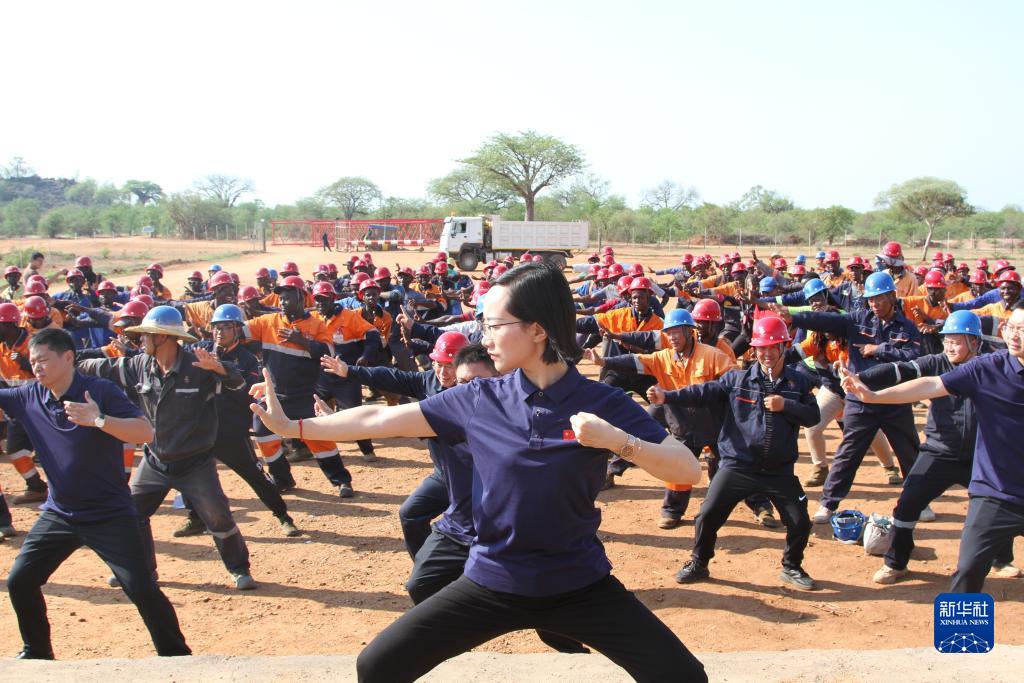 11月21日,在津巴布韋南部邊境地區的新太資源棕櫚河冶金產業園,中國醫療隊隊員帶領中企員工做八段錦。