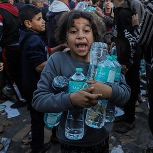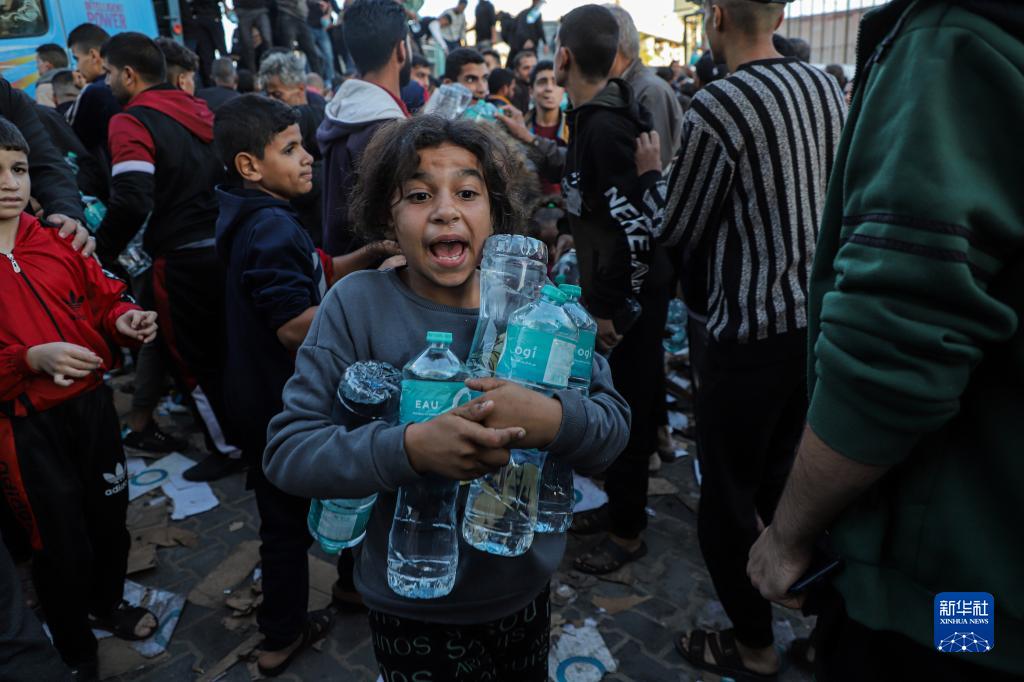 11月21日,在加沙地帶南部城市汗尤尼斯,民眾領取飲用水。