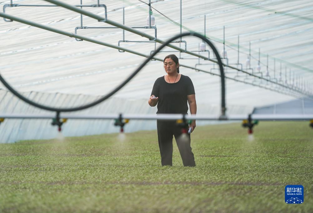 饒陽縣大尹村鎮南北巖村眾瑞合作社社長楊姍姍在新建的全鋼架無立柱新型日光溫室里遙控操作自動噴淋裝置給西紅柿幼苗澆水(11月20日攝)。