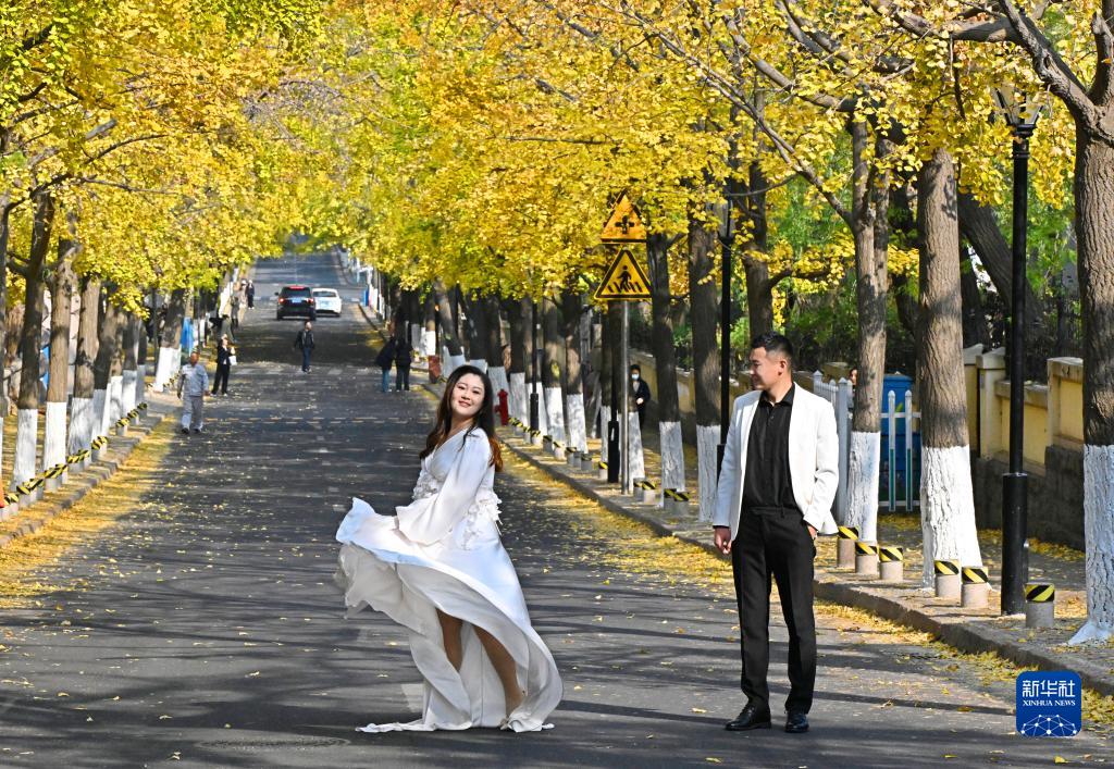11月21日,一對新人在青島市南八大關景區內拍攝。