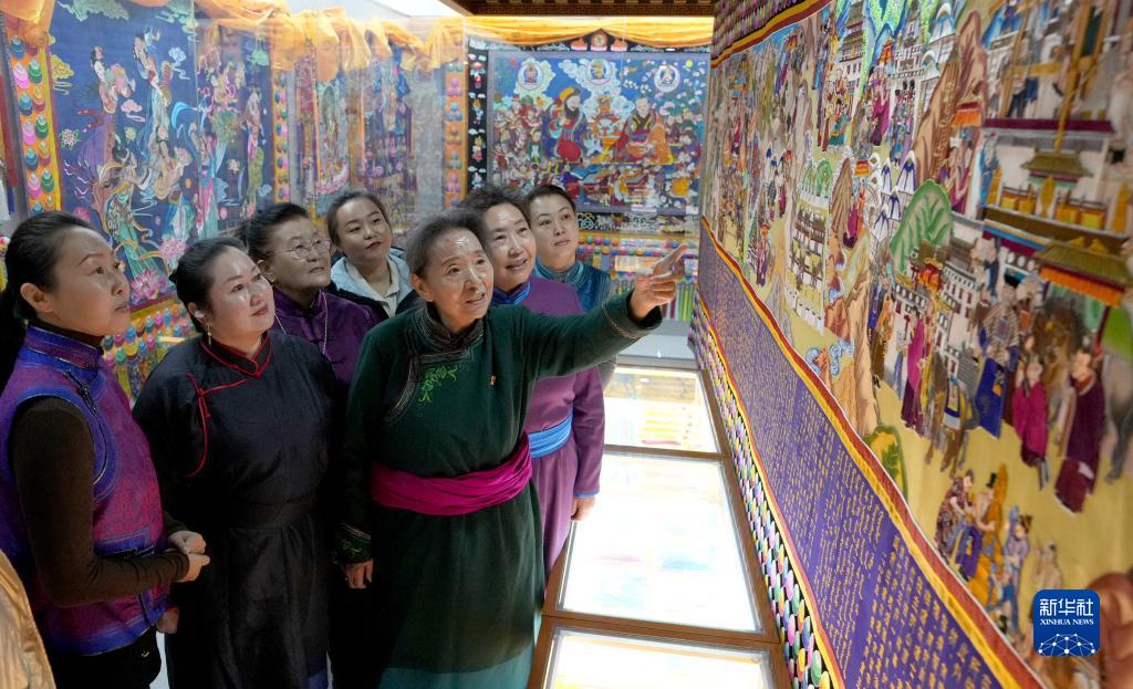 11月16日,在內蒙古阿拉善盟阿拉善左旗的馬鬃繞線蒙古族唐卡傳習所,陶格日勒(右三)給學徒們講授唐卡技藝。
