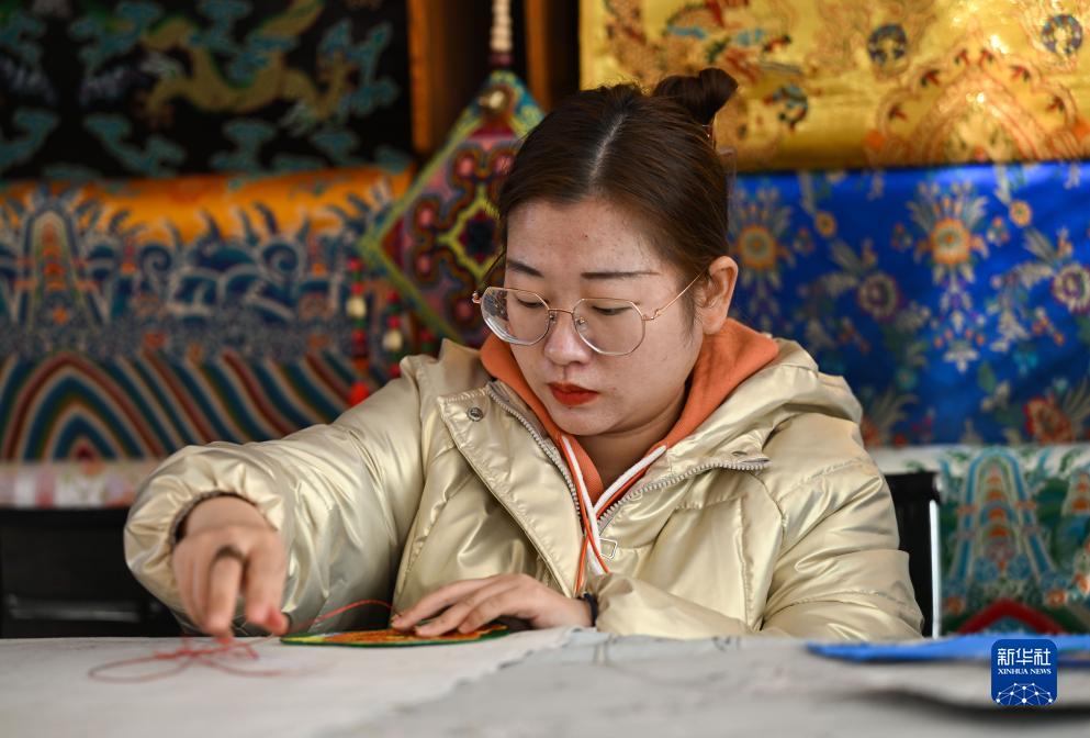 11月16日,在內蒙古阿拉善盟阿拉善左旗的馬鬃繞線蒙古族唐卡傳習所,一名學徒在制作蒙古族唐卡。