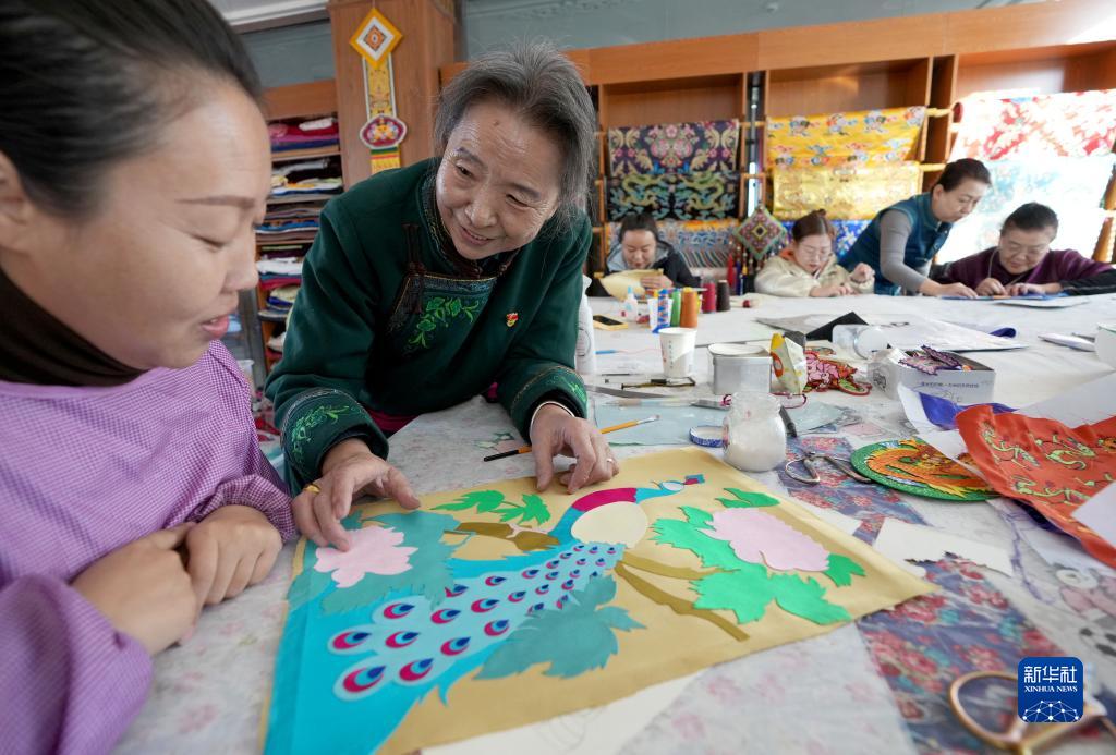 11月16日,在內蒙古阿拉善盟阿拉善左旗的馬鬃繞線蒙古族唐卡傳習所,陶格日勒(前右)給學徒講授唐卡技藝。