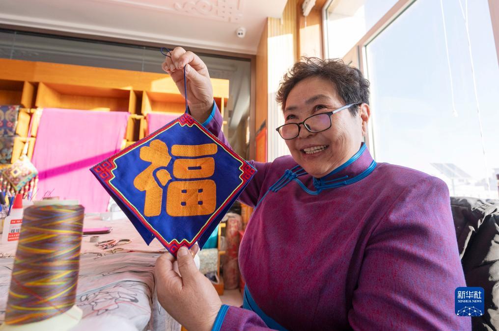 11月16日,在內蒙古阿拉善盟阿拉善左旗的馬鬃繞線蒙古族唐卡傳習所,一名牧民展示自己制作的蒙古族唐卡。