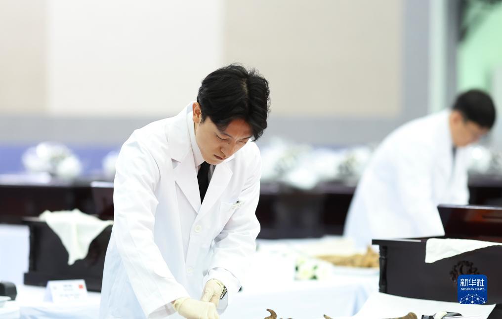 11月22日,在韓國仁川,韓方工作人員將志愿軍烈士遺骸入殮。