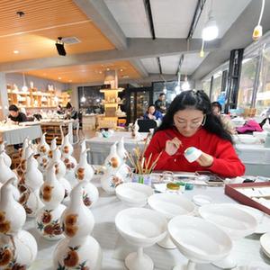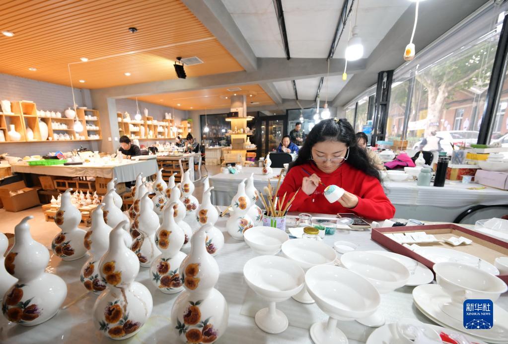 11月21日,一位工藝美術師在唐山市開平區陶瓷文創產業園創作陶瓷繪畫作品。