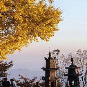 杭塢山位于浙江省諸暨市北部店口、次塢、姚江三鎮交界處,海拔500多米。初冬時節,杭塢山頂三德寺門外有著500年和300年樹齡的兩株古銀杏金黃滿樹,成為當地山鄉美麗的風景。