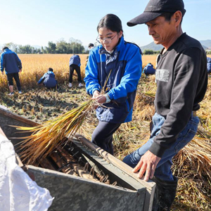 11月22日,在趙家鎮花明泉村,學生在農民的指導下學習打稻。