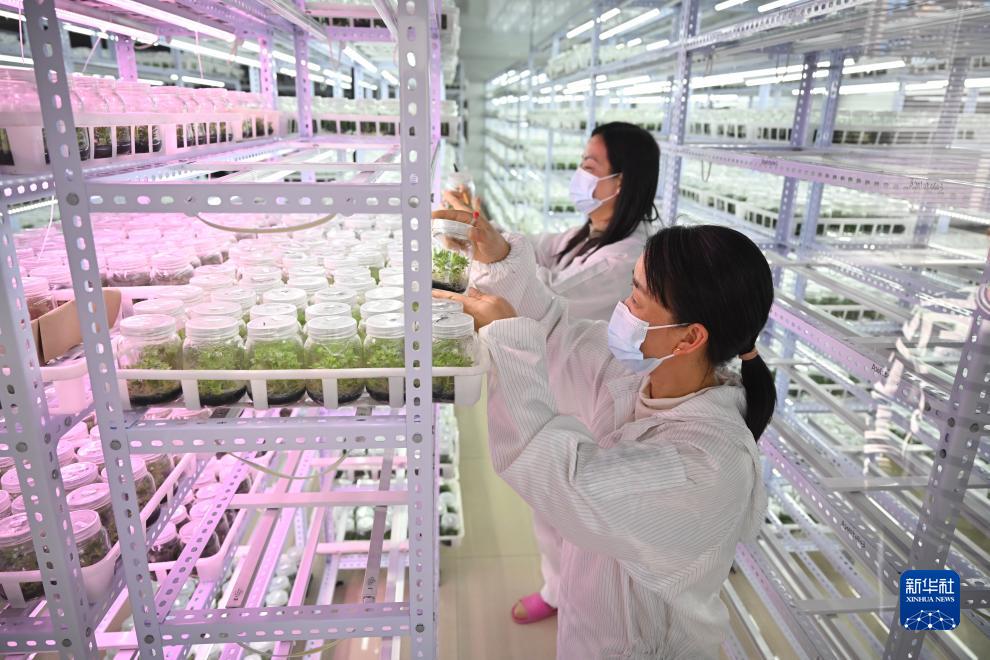 11月17日,在位于周寧縣七步鎮后洋村的福建三杉生物科技有限公司組培車間內,技術人員在查看多肉植物幼苗。