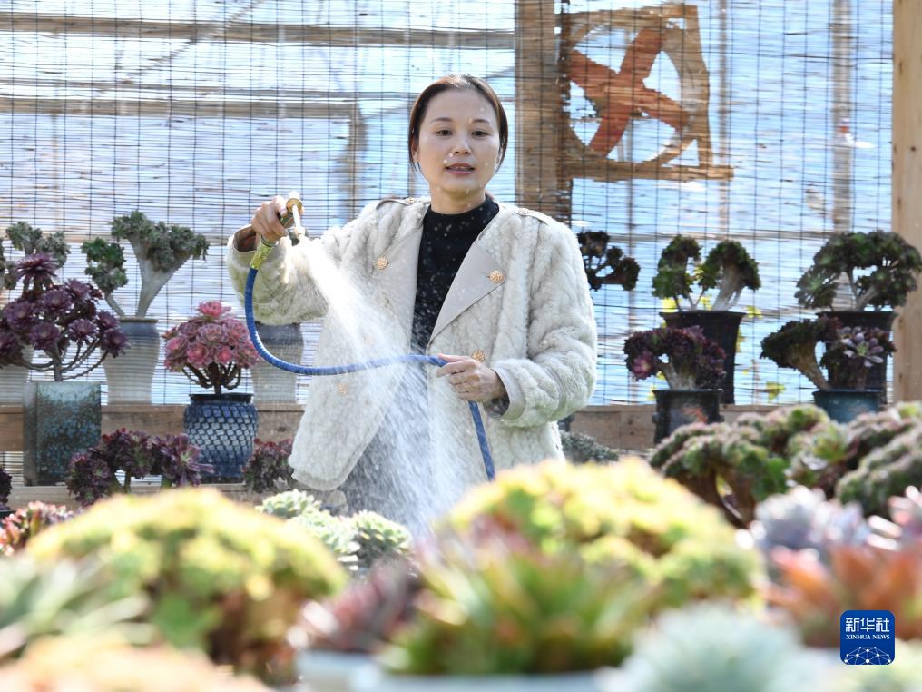 11月17日,周寧靜宇園藝有限公司負責人劉林在多肉種植園大棚內為多肉植物澆水。