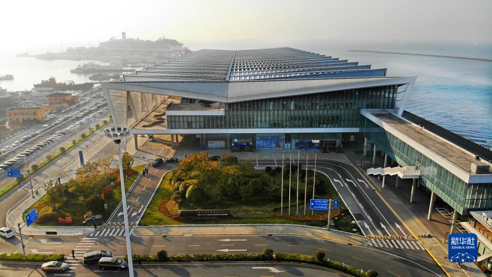 這是總建筑面積6萬平方米的青島郵輪母港客運中心。其設計最高通關能力可達每小時3000-4000人次,年接待能力達150萬人次。主要功能為聯檢大廳,同時配套免稅商店等商業服務功能(11月21日攝,無人機照片)。