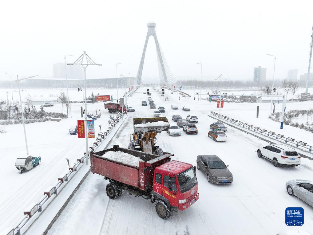 11月22日,霍林郭勒市政部門清掃路面積雪(無人機照片)。