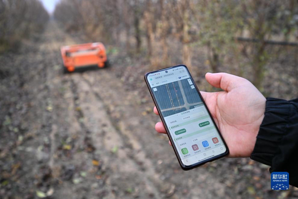 工作人員在威縣賀營鎮紅龍集村的梨園里用手機監控無人割草機器人工作(11月21日攝)。