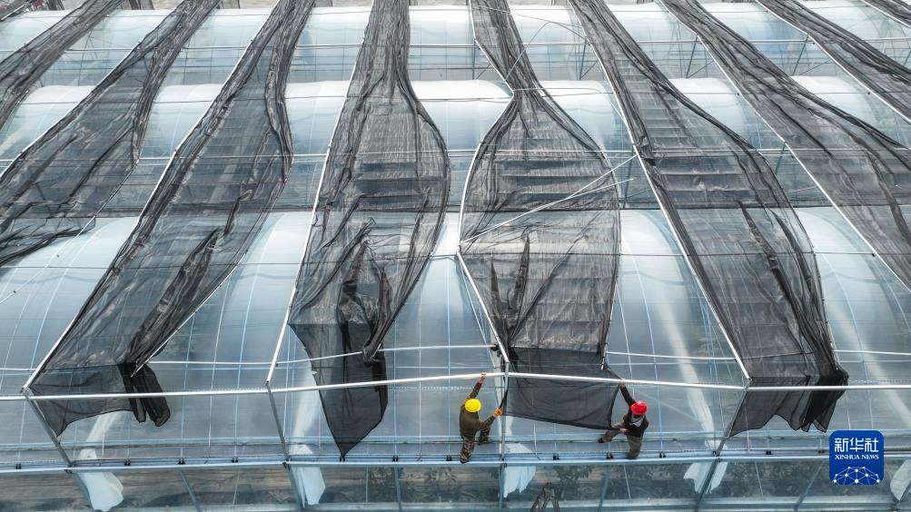11月22日,河北省遵化市石門鎮農民在苫蓋設施大棚(無人機照片)。