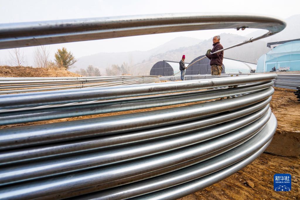 11月22日,河北省遵化市石門鎮農民在搬運拱架,搭建設施大棚為蔬菜大棚防寒。