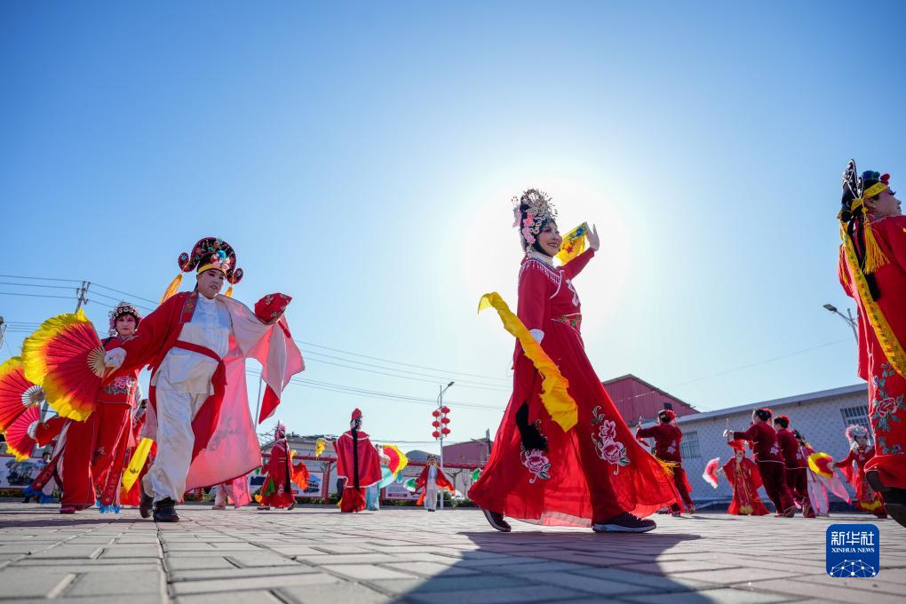 河北省灤州市葛莊村地秧歌隊隊員在村廣場上表演(11月17日攝)。