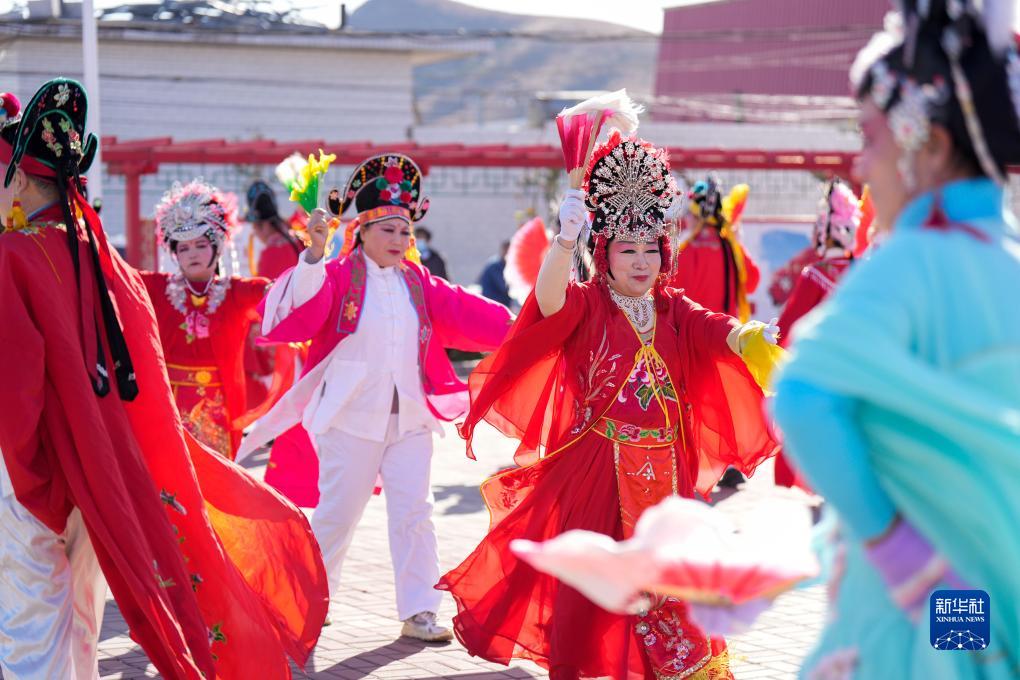 河北省灤州市葛莊村地秧歌隊隊員在村廣場上表演(11月17日攝)。