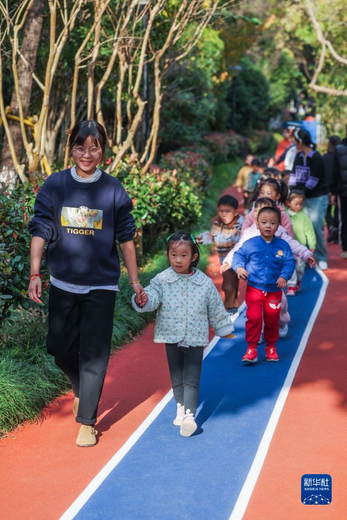 11月22日,湖州市第三幼兒園的孩子們在老師的帶領下來到龍泉街道的環河健康步道玩耍。