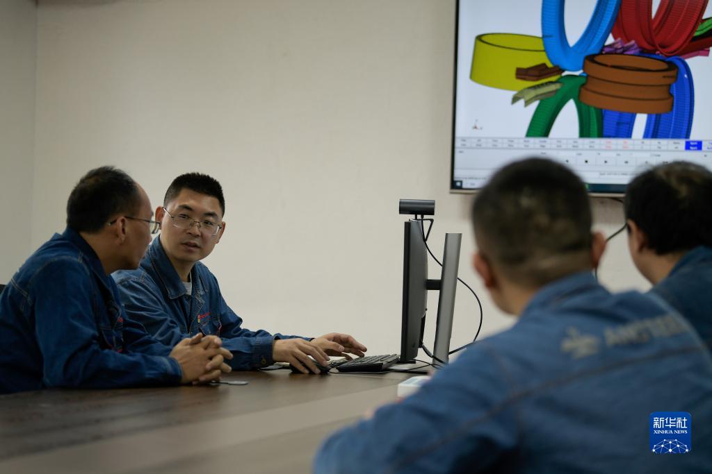 11月21日,在攀鋼釩軌梁廠,呂攀峰(左二)與團隊成員利用仿真軟件對新產品設計情況進行分析。