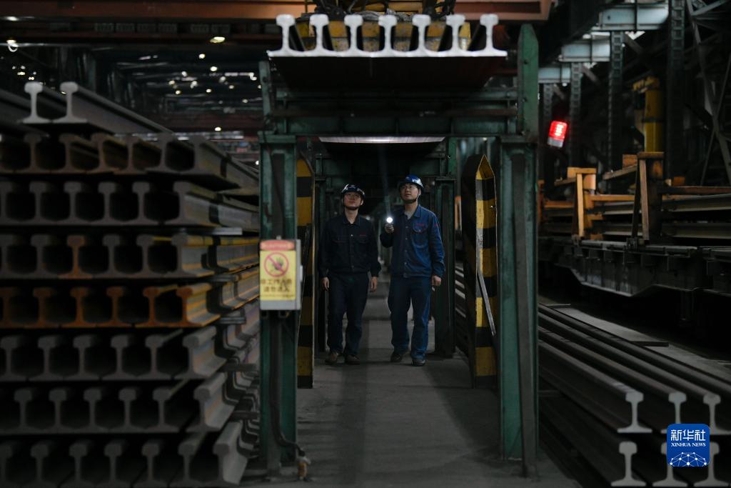 11月21日,在攀鋼釩軌梁廠,呂攀峰(右)與同事檢查鋼軌成品底部表面質量。
