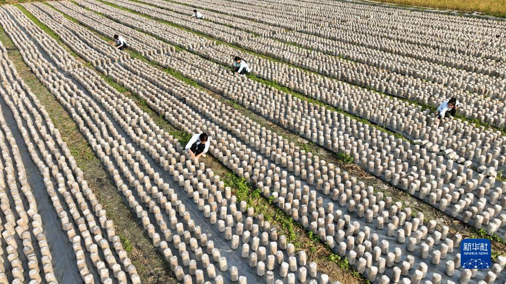 11月22日,村民在貴州省黔東南苗族侗族自治州榕江縣平江鎮平江村黑木耳種植基地排放菌棒(無人機照片)。