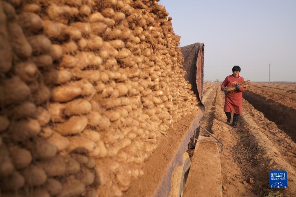 11月22日,農民在河北省邢臺市內丘縣金店鎮麻山藥種植基地里收獲麻山藥。