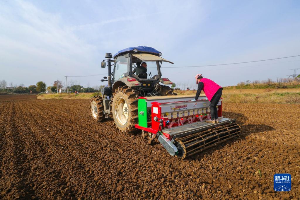 11月22日,在河南省信陽市光山縣十里鎮永輝高效示范園種植基地,農民駕駛播種機播種小麥。