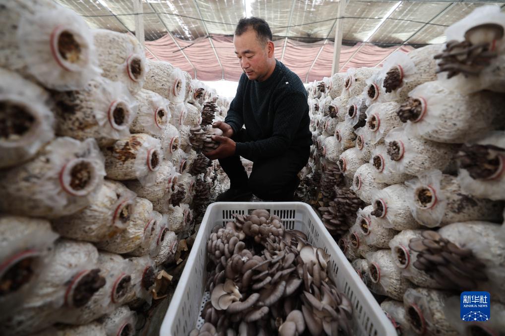 11月22日,山東省臨沂市沂南縣銅井鎮靈山村農民在大棚里收獲蘑菇。