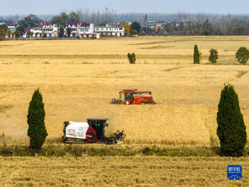 11月22日,在安徽省合肥市肥東縣包公鎮王集社區高標準農田,農民駕駛收割機收割晚稻(無人機照片)。