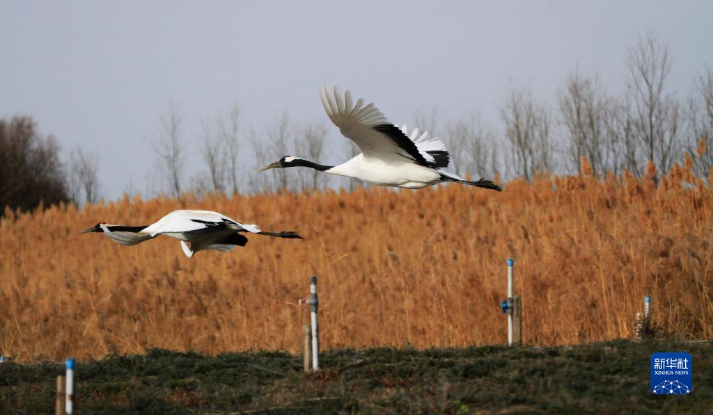 11月22日,兩只丹頂鶴在甘肅張掖國家濕地公園鶴園飛舞。
